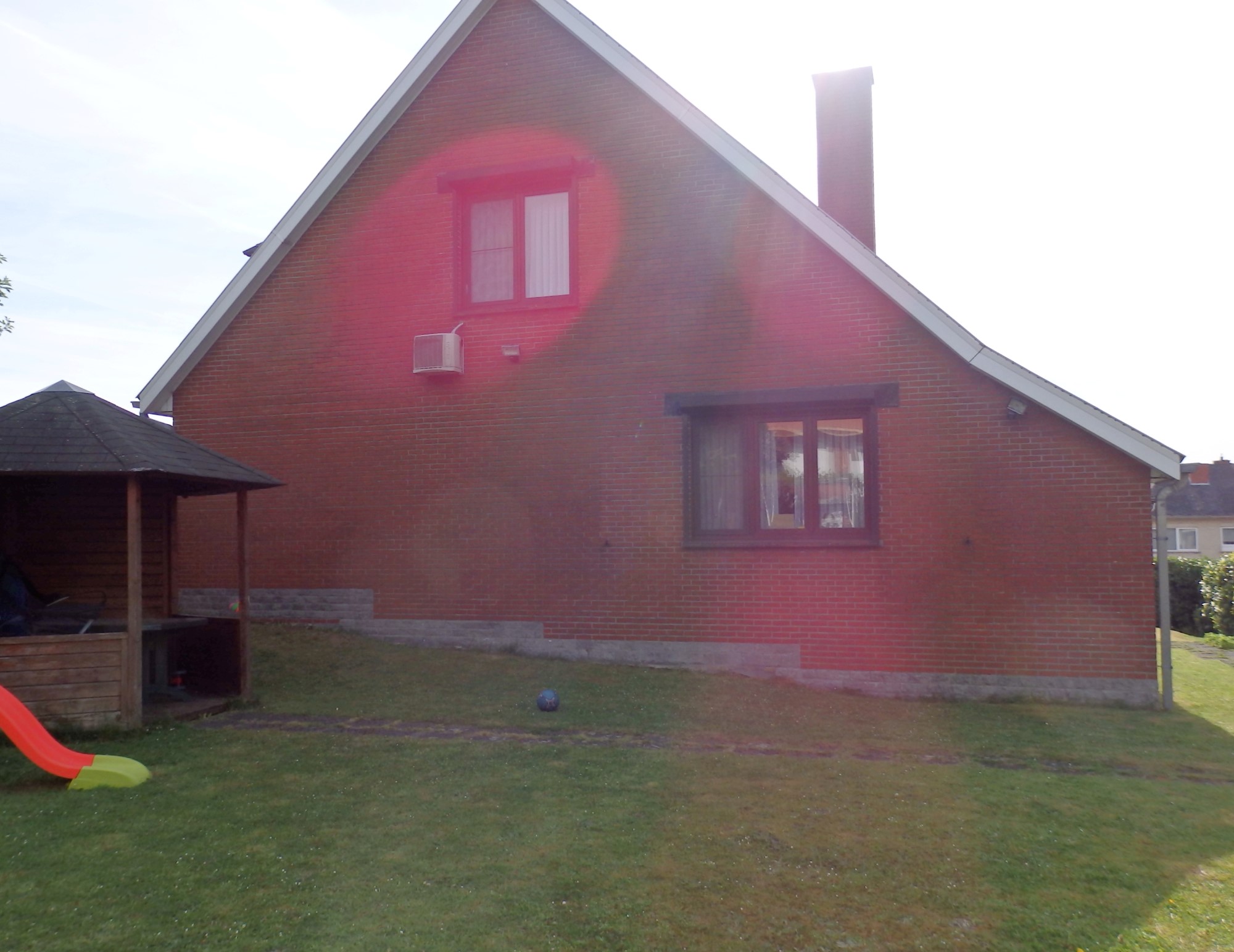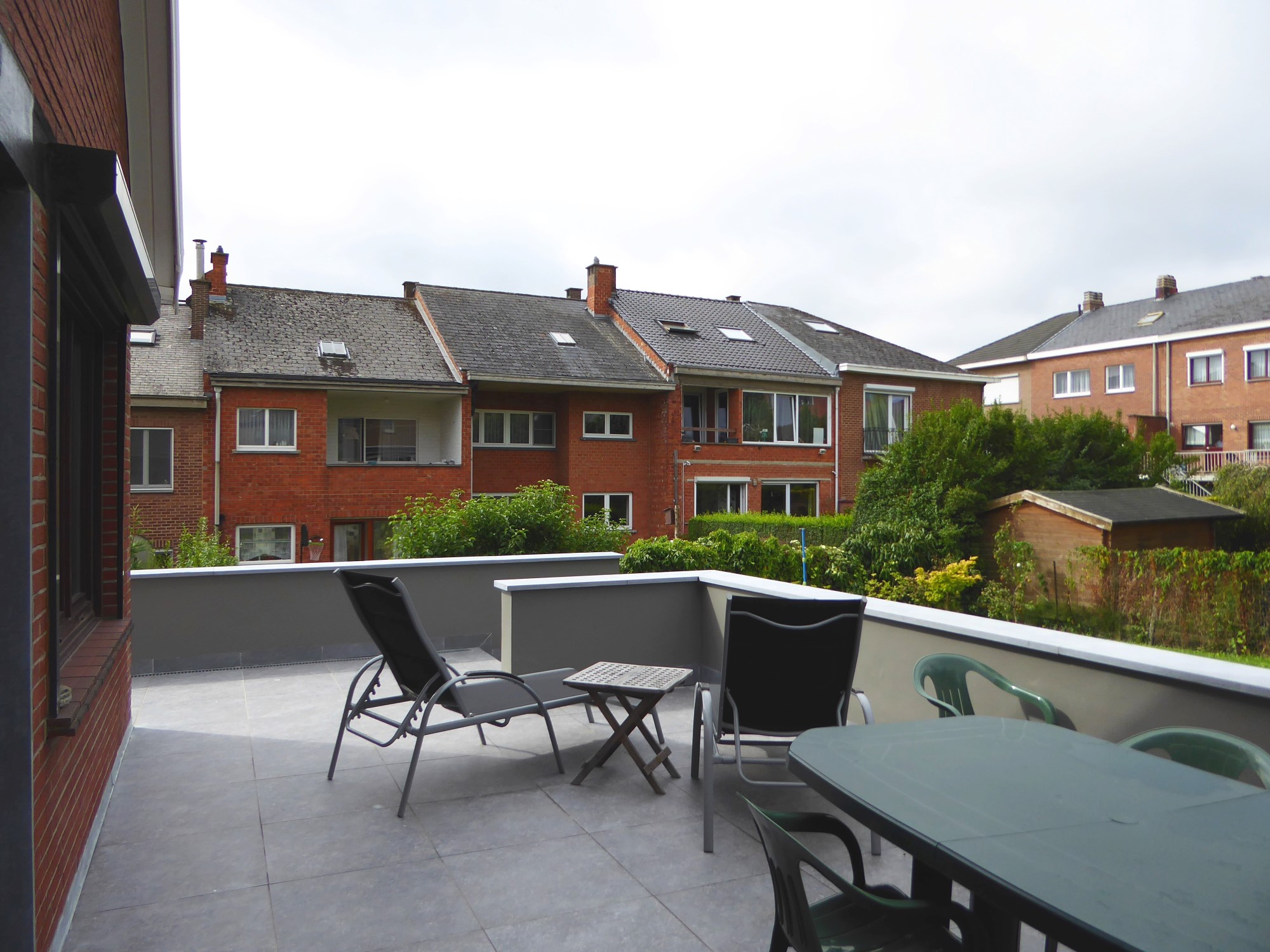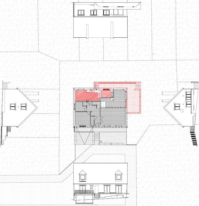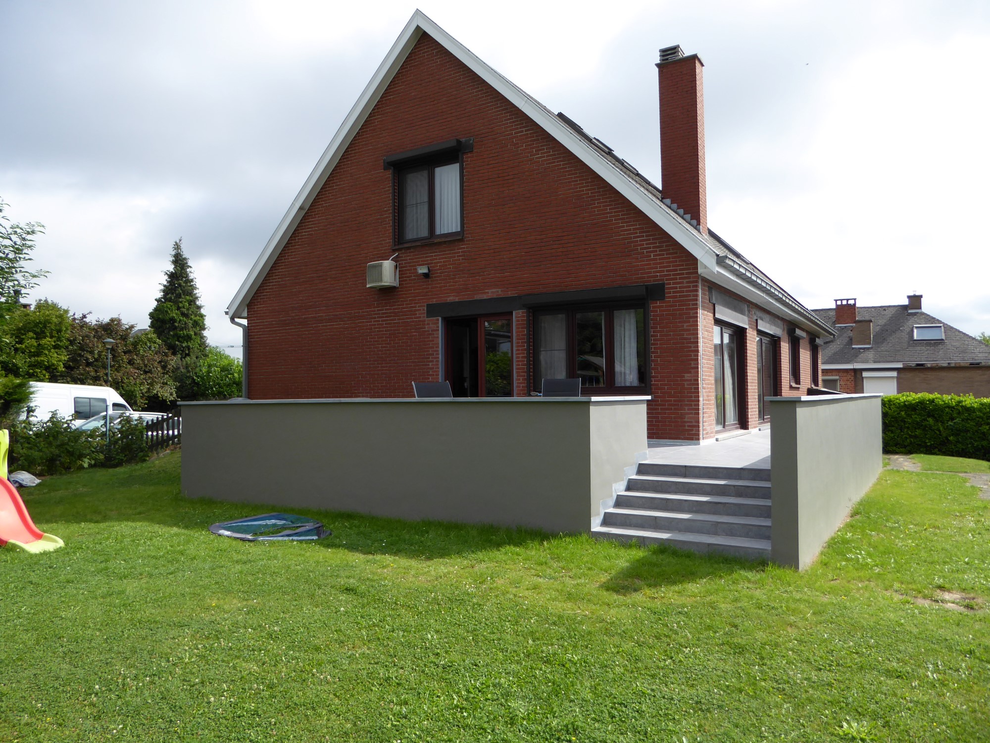 Dans le même élan, la terrasse extérieure est modifiée. Elle est agrandie et s'implante désormais sur les côtés orientés Sud et Ouest. Elle est accessible depuis plusieurs pièces de la maison. À cette fin une porte supplémentaire est aménagée dans la façade sud, à l'identique des baies existantes et dans le respect du style de l'édifice. À son tour, la terrasse donne accès à plusieurs parties du jardin, via deux escaliers. L'un d'eux est un ancien escalier que l'on conserve, de même que la partie de terrasse déjà existante ; ces éléments sont maintenus et participent pleinement au projet. Le garde-corps est enduit de façon à confondre les parties neuves et anciennes de la terrasse.