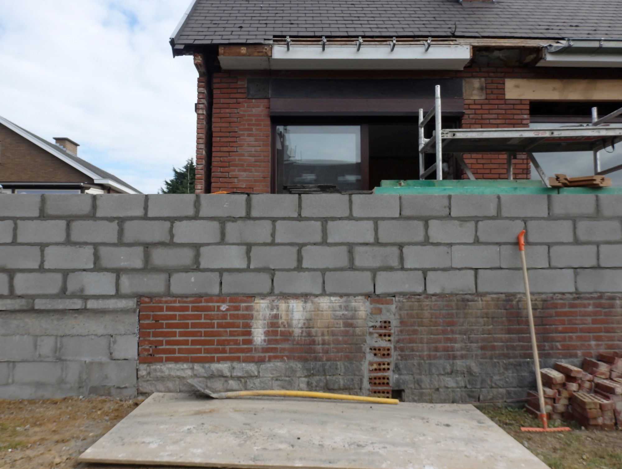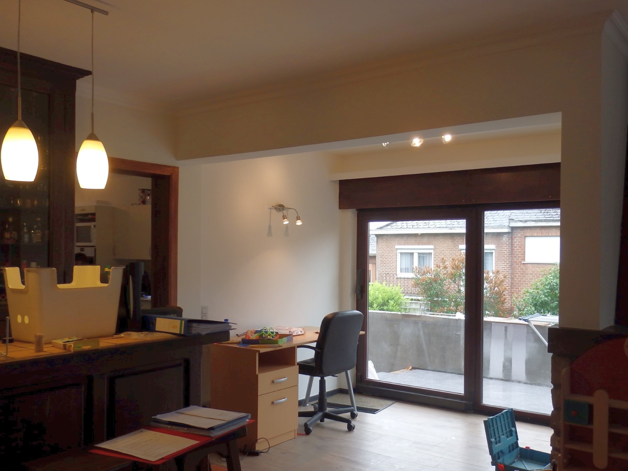 Une importante croissance familiale incite à agrandir la cuisine du domicile. Le doublement de sa superficie se réalise simplement, par l'abattage d'une cloison et le déplacement de l'ancien local bureau. Celui-ci est déplacé vers un espace extérieur couvert, qui est converti en espace intérieur. Le châssis existant est ici utilisé directement en réemploi sur site : il est simplement démonté puis remonté trois mètres en avant. On garantit ainsi le respect du style de la maison, une économie certaine, ainsi que la réduction des déchets de construction et de l'empreinte environnementale. En outre, un ancien élément de barbecue extérieur maçonné, désormais situé dans le bureau, est converti en étagère. Ces différentes permutations permettent d'agrandir le living et de rationaliser le plan rectangulaire du rez-de-chaussée.